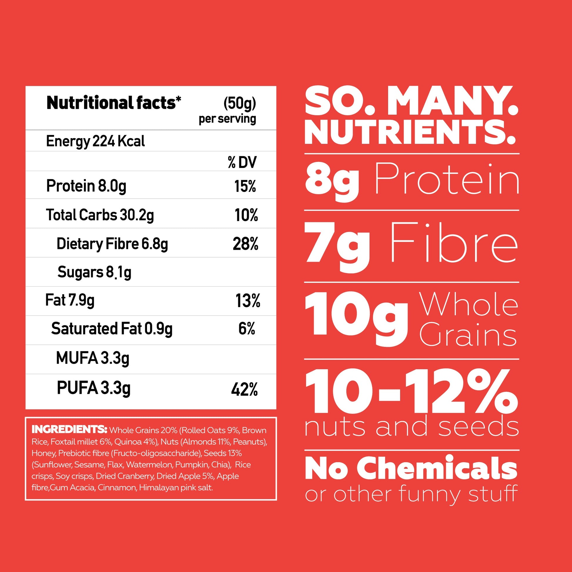 Did we really pack in oats, millets and almonds into a bar? Yes, yes and yes. Did we mention 10g of whole grains? And nuts? And seeds? TL/DR: It's nutritious.